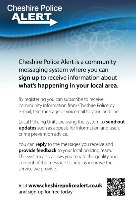 In emergency call 999. For less urgent matters call 101. For even less urgent matters contact Cheshire police website.