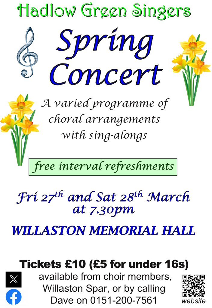 Tickets £10 (£5 under 16s) (refreshments included) from Willaston Spar, choir members, or Dave on 0151 200 7561.