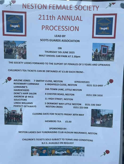 The 211th annual procession of Neston Female Society will start at the Malt Shovel car park at 2.30 pm. Ladies aged 5 years and upwards will be led by the Pipe Band from the Scots Guards Association. After a service in the Parish Church, the procession will go to Neston Cross, and finish at the British Legion, where members will have tea.