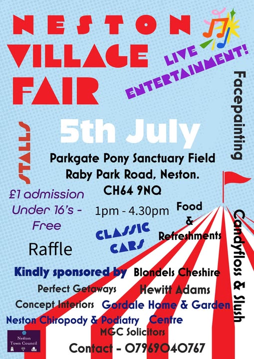 Unfortunately, Comrade’s Field is badly rutted, so the Fair will be on a field off Raby Park Road: going from Neston, it is past the High School and on the right. (It was once used by Parkgate Pony Sanctuary and is still shown thus on Google maps.)