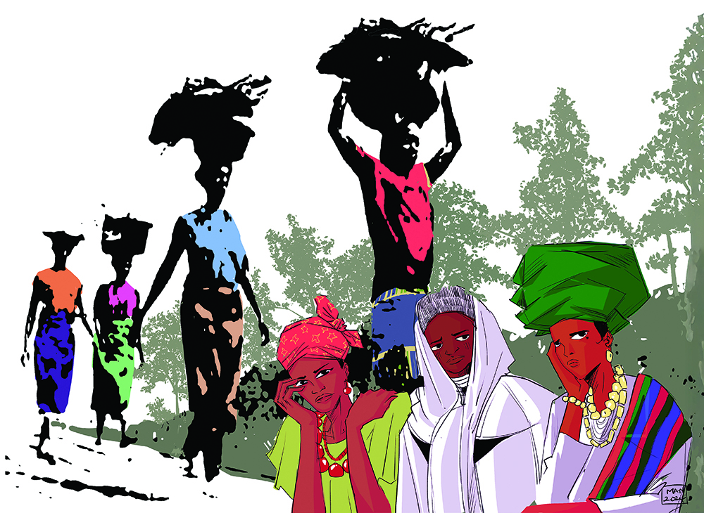 The artwork, by Gift Amarachi Ottah, depicts the daily reality of rural Nigerian women whose lives are marked by endless labour from sunrise to sunset. These women traverse treacherous paths to their farms, often carrying both their harvest and their children – a toddler strapped to their back, a heavy load balanced on their head while guiding other children along unmaintained roads through thick bush. The artwork also shows three women sitting together, their different traditional attire representing Nigeria’s diverse cultures. Though they come from different ethnic groups, their shared experiences unite them. To meet their basic survival needs, these women carry burdens and traumas that are physical, emotional and spiritual.