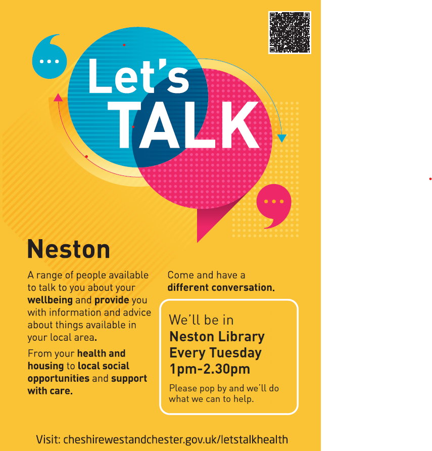 Every Tuesday between 1pm and 2.30pm Neston Library will host a “Let’s Talk” service. There will be a range of people available to talk to you about your wellbeing and provide you with information and advice about things available in your local area.