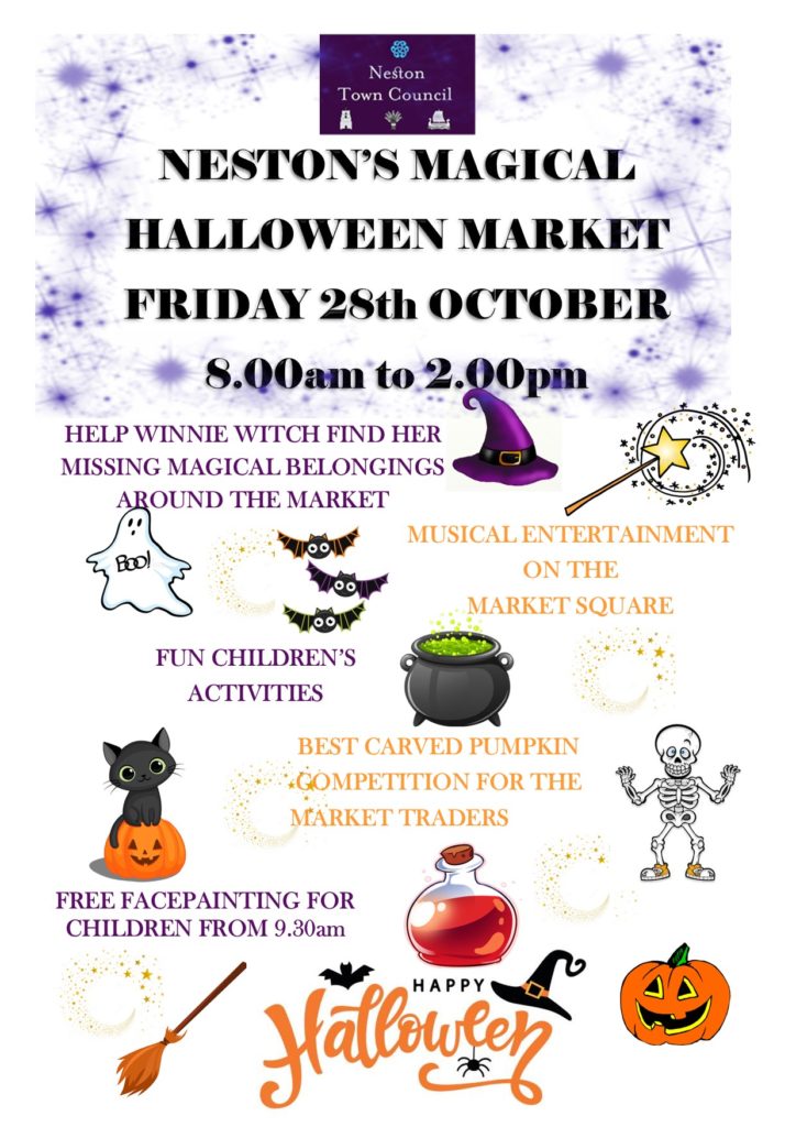 This year Neston Town Council will be holding their magical Halloween market on Friday 28th October.  Neston Town Council will be holding a book stall with proceeds raised being donated to the Wirral and Neston Rotary Hub. Our Mayor, Cllr Pat Kynaston, and the Deputy Mayor, Cllr Sion Jones, will be presenting a prize for the Market Traders’ best carved pumpkin competition. The pumpkins this year are donated by our Councillor, Sion Jones.  You are invited to come and judge the imaginatively crafted entries for yourself and make your vote for the winner at the Neston Town Council stall.  There may be a Halloween themed character or two helping out on a stall or wandering around, perhaps doing their Halloween party shopping? So don’t miss a TRICK come and stock up on some TREATs for Halloween weekend.