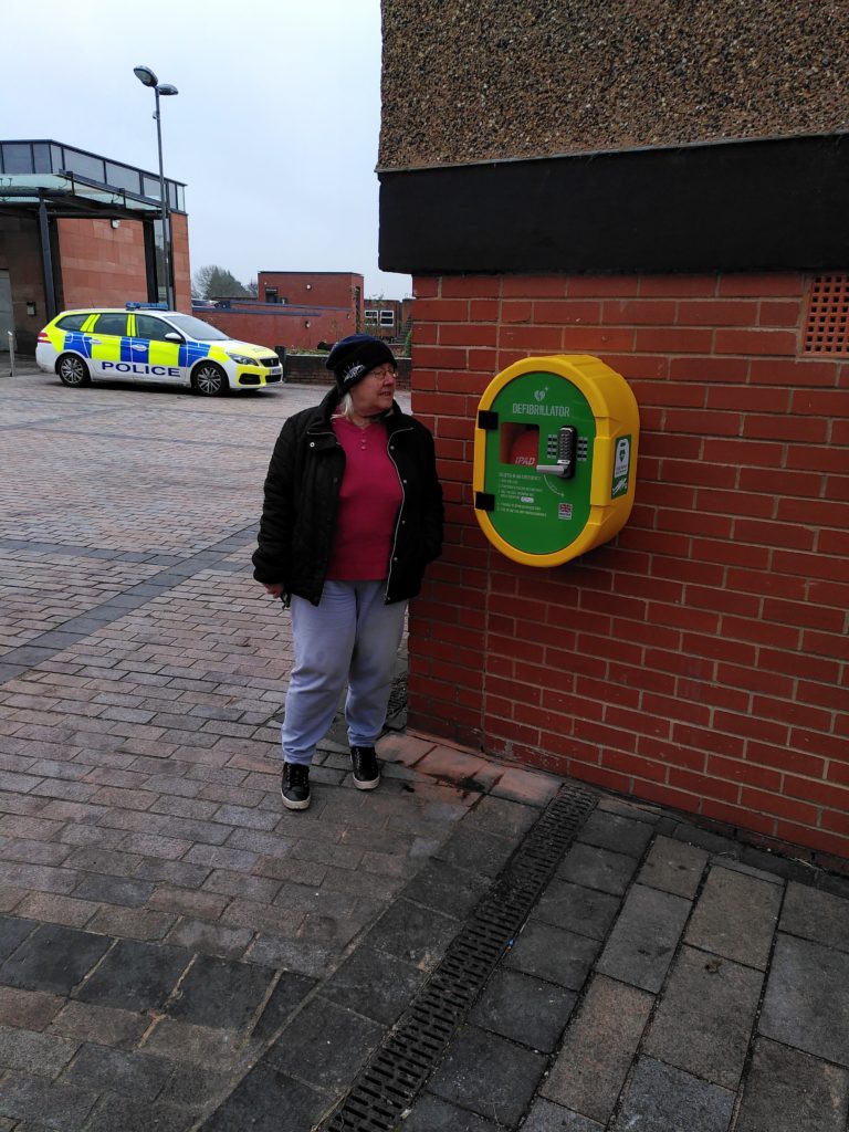 Cllr Brenda Marple viewing the newly installed defibrillator
